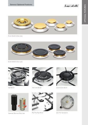 General Optional Features OPTIONAL FEATURES Burner Model A (brass type) Burner Model B (brass type) Triple Burner Mat Cover Burner Enamel Cover Burner Telescopic Black and Silver Legs Pipe Pool Type Burner Euro Pool Type Burner