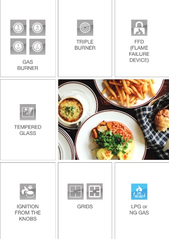 TRIPLE FFD 3 2 BURNER (FLAME FAILURE GAS DEVICE) BURNER TEMPERED GLASS LPG NG GAS IGNITION GRIDS LPG or FROM THE NG GAS KNOBS